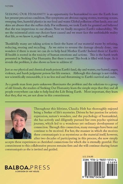 Exciting News: Seeking Our Humanity received Honorable Mention Award at the 2020 Paris Book Festival Seeking Our Humanity is an opportunity for humankind to save the Earth from her present precarious condition. Her symptoms are obvious: raging storms, warming oceans, sweeping fires, harmful plastics in our food and water. Global pollution of her lands, seas and skies are abuses that she suffers daily. For millennia, we took Earth for granted and believed that she was impervious to our abuses. Now we finally recognize Earth's vulnerability. We see the existential crisis our choices have caused and we must face the unthinkable reality that life, as we know it, might well end. Thankfully many are taking action to limit the harm of our material waste by refusing, reducing, reusing and recycling. As we strive to reverse the damage already done, one wonders if there is more we can do to help heal Mother Earth? Indeed there is! Earth's ill health is rooted in the toxicity of human emotions and actions. This is the harsh truth presented in Seeking Our Humanity. But there is more! This book is filled with hope. As it reveals the problem, it also shows us how to address it! Just as our physical and chemical trash poison Earth's land, sky and waters, our hatred, anger, violence, and harsh judgment poison her life essence. Although this damage is not visible, nor scientifically measurable, it is no less real and threatening to Earth's survival and ours. As a gentle man from parts unknown illuminates the problem and the solutions to a group of old friends, the readers of Seeking Out Humanity learn the simple steps that they and all people everywhere can take to help heal the Life Being Earth. Most important, they learn that they, that we, are not alone in this commitment.