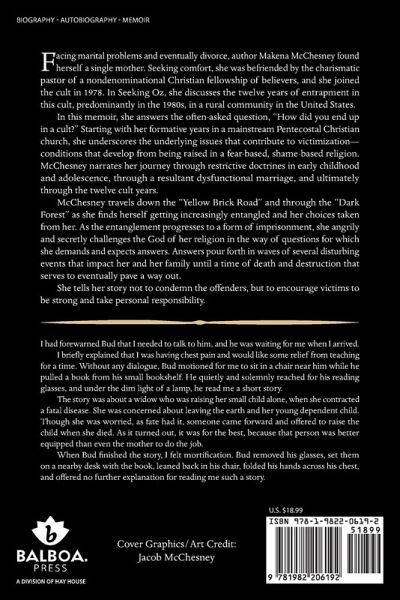 Facing marital problems and eventually divorce, author Makena McChesney found herself a single mother. Seeking comfort, she was befriended by the charismatic pastor of a nondenominational Christian fellowship of believers, and she joined the cult in 1978. In Seeking Oz, she discusses the twelve years of entrapment in this cult, predominantly in the 1980s, in a rural community in the United States. In this memoir, she answers the often-asked question, How did you end up in a cult? Starting with her formative years in a mainstream Pentecostal Christian church, she underscores the underlying issues that contribute to victimizationconditions that develop from being raised in a fear-based, shame-based religion. McChesney narrates her journey through restrictive doctrines in early childhood and adolescence, through a resultant dysfunctional marriage, and ultimately through the twelve cult years. McChesney travels down the Yellow Brick Road and through the Dark Forest as she finds herself getting increasingly entangled and her choices taken from her. As the entanglement progresses to a form of imprisonment, she angrily and secretly challenges the God of her religion in the way of questions for which she demands and expects answers. Answers pour forth in waves of several disturbing events that impact her and her family until a time of death and destruction that serves to eventually pave a way out. She tells her story not to condemn the offenders, but to encourage victims to be strong and take personal responsibility. I had forewarned Bud that I needed to talk to him, and he was waiting for me when I arrived. I briefly explained that I was having chest pain and would like some relief from teaching for a time. Without any dialogue, Bud motioned for me to sit in a chair near him while he pulled a book from his small bookshelf. He quietly and solemnly reached for his reading glasses, and under the dim light of a lamp, he read me a short story. The story was about a widow who was raising her small child alone, when she contracted a fatal disease. She was concerned about leaving the earth and her young dependent child. Though she was worried, as fate had it, someone came forward and offered to raise the child when she died. As it turned out, it was for the best, because that person was better equipped than even the mother to do the job. When Bud finished the story, I felt mortification. Bud removed his glasses, set them on a nearby desk with the book, leaned back in his chair, folded his hands across his chest, and offered no further explanation for reading me such a story.