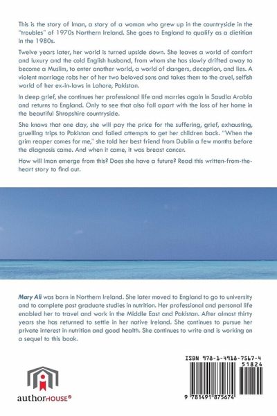 This is the story of Iman, a story of a woman who grew up in the countryside in the "troubles" of 1970s Northern Ireland. She goes to England to qualify as a dietitian in the 1980s. Twelve years later, her world is turned upside down. She leaves a world of comfort and luxury and the cold English husband, from whom she has slowly drifted away to become a Muslim, to enter another world, a world of dangers, deception, and lies. A violent marriage robs her of her two beloved sons and takes them to the cruel, selfish world of her ex-in-laws in Lahore, Pakistan. In deep grief, she continues her professional life and marries again in Saudia Arabia and returns to England. Only to see that also fall apart with the loss of her home in the beautiful Shropshire countryside. She knows that one day, she will pay the price for the suffering, grief, exhausting, gruelling trips to Pakistan and failed attempts to get her children back. "When the grim reaper comes for me," she told her best friend from Dublin a few months before the diagnosis came. And when it came, it was breast cancer. How will Iman emerge from this? Does she have a future? Read this written-from-the-heart story to find out.