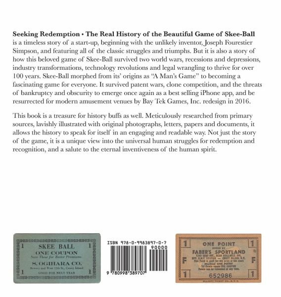 Seeking Redemption • The Real Story of the Beautiful Game of Skee-Ball is the first and only book about the history of Skee-Ball, and the authoritative history of the game. Seeking Redemption tells a timeless story of a start-up, beginning with the unlikely inventor, Joseph Fourestier Simpson, and featuring all of the classic struggles and triumphs. It is also a story of how this beloved game of Skee-Ball survived two world wars, recessions and depressions, industry transformations, technology revolutions and legal wrangling to thrive for over 100 years. Skee-Ball morphed from its' origins as "A Man's Game" to becoming a fascinating game for everyone. It's continued to survive patent wars, clone competition, and the threats of bankruptcy and obscurity to emerge once again as a best selling iPhone app, and be resurrected for modern amusement venues by Bay Tek Games, Inc. redesign in 2016. This book is a treasure for history buffs as well. Meticulously researched from primary sources, lavishly illustrated with original photographs, letters, papers and documents, it allows the history to speak for itself in an engaging and readable way. Not just the story of the game, it is a unique view into the universal human struggles for redemption and recognition, and a salute to the eternal inventiveness of the human spirit.