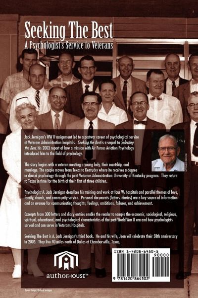 Psychologist A. Jack Jernigan describes his training and work at four Veterans Administration Hospitals. The story samples the economic, sociological, and psychological characteristics of the post World War II era and how psychologists served and can serve in V A Hospitals. The story begins with a veteran of World War II meeting a young lady, their courtship, and marriage. The couple move from Texas to Kentucky where he received a Ph.D. in Clinical Psychology through the joint Veterans Administration - University of Kentucky program. They return to Texas in time for the birth of their first of three children. This is A. Jack Jernigan's third book. Jack and wife, Jean celebrate 58 years of marriage in 2005.