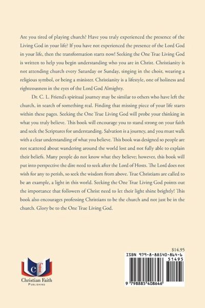 Are you tired of playing church? Have you truly experienced the presence of the Living God in your life? If you have not experienced the presence of the Lord God in your life, then the transformation starts now! Seeking the One True Living God is written to help you begin understanding who you are in Christ. Christianity is not attending church every Saturday or Sunday, singing in the choir, wearing a religious symbol, or being a minister. Christianity is a lifestyle, one of holiness and righteousness in the eyes of the Lord God Almighty. Dr. C. L. Friend's spiritual journey may be similar to others who have left the church, in search of something real. Finding that missing piece of your life starts within these pages. Seeking the One True Living God will probe your thinking in what you truly believe. This book will encourage you to stand strong on your faith and seek the Scriptures for understanding. Salvation is a journey, and you must walk with a clear understanding of what you believe. This book was designed so people are not scattered about wandering around the world lost and not fully able to explain their beliefs. Many people do not know what they believe; however, this book will put into perspective the dire need to seek after the Lord of Hosts. The Lord does not wish for any to perish, so seek the wisdom from above. True Christians are called to be an example, a light in this world. Seeking the One True Living God points out the importance that followers of Christ need to let their light shine brightly! This book also encourages professing Christians to be the church and not just be in the church. Glory be to the One True Living God.