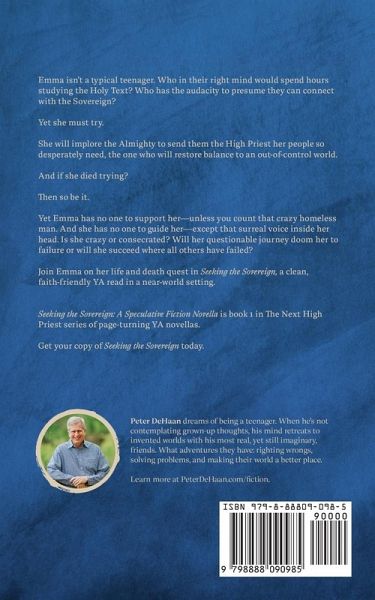 Emma isn't a typical teenager. Who in their right mind would spend hours studying the Holy Text? Who has the audacity to presume they can connect with the Sovereign? Yet she must try. She will implore the Almighty to send them the High Priest her people so desperately need, the one who will restore balance to an out-of-control world. And if she died trying? Then so be it. Yet Emma has no one to support her-unless you count that crazy homeless man. And she has no one to guide her-except that surreal voice inside her head. Is she crazy or consecrated? Will her questionable journey doom her to failure or will she succeed where all others have failed? Join Emma on her life and death quest in Seeking the Sovereign, a clean, faith-friendly YA read in a near-world setting. Seeking the Sovereign: A Speculative Fiction Novella is book 1 in The Next High Priest series of page-turning YA novellas. Get your copy of Seeking the Sovereign today.