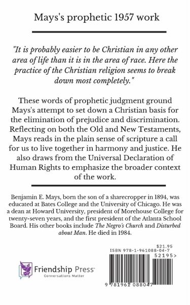 "It is probably easier to be Christian in any other area of life than it is in the area of race. Here the practice of the Christian religion seems to break down most completely." ¿These words of prophetic judgment ground Mays's attempt to set down a Christian basis for the elimination of prejudice and discrimination. Reflecting on both the Old and New Testaments, Mays reads in the plain sense of scripture a call for us to live together in harmony and justice. He also draws from the Universal Declaration of Human Rights to emphasize the broader context of the work.