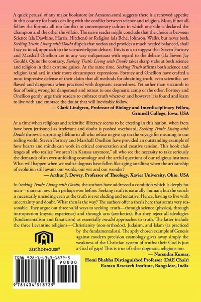 Exploring the intersection of art, science and religion, "Seeking Truth: Living with Doubt" considers that all three are paths to the same end. Attacking not only the unyielding smugness of evolutionary biologists but also the uncompromising surety of Fundamentalist figureheads (in both the Christian and Islamic faiths), author Steven Fortney and Marshall Onellion take the reader on a path that disavows all such certainties and considers the thought-provoking question; What does it mean to live with doubt? Far from leaving questions unanswered, instead they tackle such questions as proof versus faith, the impossibility of absolute understanding, and how a combination of art, science and religion can lead to a transcendence of that which we cannot know. In so doing, they expose the dangers of "certainty," be it in religion, science or any other ideology that claims to offer absolute truth. "Seeking Truth: Living with Doubt" has been endorsed by theologians (Arthur Dewey, Professor of Theology, Xavier University [a Jesuit University], Ohio, USA), biologists (Clark Lindgren, Grinnell College, Iowa, USA), and physicists (Narendra Kumar, Director of the Raman Research Institute, Bangalore, India), by Christians, Jews, Hindus and Buddhists. It will appeal to those interested in the two channels of truth seeking: transcencence (also called religion) and the physical world (also called science). The book interconnects many science topics, including cosmology, neurobiology and evolution, to religion and the arts. It also proposes some unorthodox ideas, including the equivalence of the Christian concept of Grace and the Buddhist concept of Emptiness, and that what a religious devout person does in prayer is identical to what a writer does during the creative process.