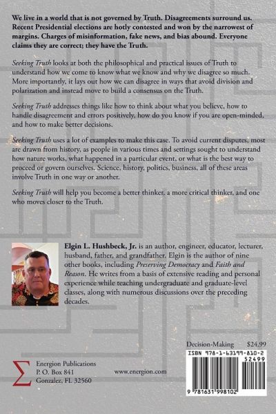 We live in a world that is not governed by Truth. Disagreements surround us. Recent Presidential elections are hotly contested and won by the narrowest of margins. Charges of misinformation, fake news, and bias abound. Everyone claims they are correct; they have the Truth. Seeking Truth looks at both the philosophical and practical issues of Truth to understand how we come to know what we know and why we disagree so much. More importantly, it lays out how we can disagree in ways that avoid division and polarization and instead move to build a consensus on the Truth. Seeking Truth addresses things like how to think about what you believe, how to handle disagreement and errors positively, how do you know if you are open-minded, and how to make better decisions. Seeking Truth uses a lot of examples to make this case. To avoid current disputes, most are drawn from history, as people in various times and settings sought to understand how nature works, what happened in a particular event, or what is the best way to proceed or govern ourselves. Science, history, politics, business, all of these areas involve Truth in one way or another. Seeking Truth will help you become a better thinker, a more critical thinker, and one who moves closer to the Truth.