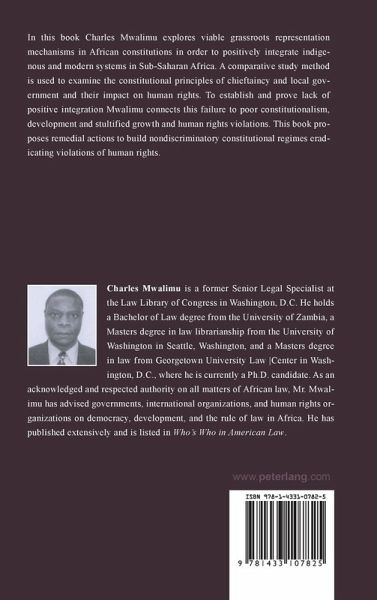 In this book Charles Mwalimu explores viable grassroots representation mechanisms in African constitutions in order to positively integrate indigenous and modern systems in Sub-Saharan Africa. A comparative study method is used to examine the constitutional principles of chieftaincy and local government and their impact on human rights. To establish and prove lack of positive integration Mwalimu connects this failure to poor constitutionalism, development and stultified growth and human rights violations. This book proposes remedial actions to build nondiscriminatory constitutional regimes eradicating violations of human rights.