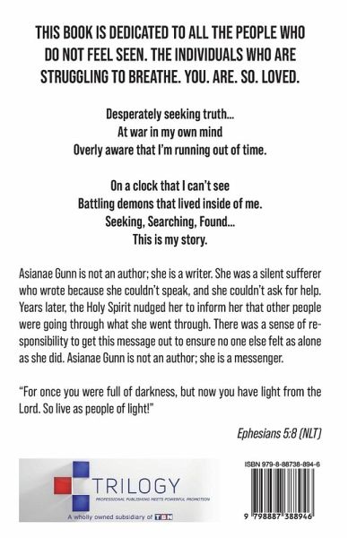 THIS BOOK IS DEDICATED TO ALL THE PEOPLE WHO DO NOT FEEL SEEN. THE INDIVIDUALS WHO ARE STRUGGLING TO BREATHE. YOU. ARE. SO. LOVED. Desperately seeking truth... At war in my own mind Overly aware that I'm running out of time. On a clock that I can't see Battling demons that lived inside of me. Seeking, Searching, Found... This is my story. Asianae Gunn is not an author; she is a writer. She was a silent sufferer who wrote because she couldn't speak, and she couldn't ask for help. Years later, the Holy Spirit nudged her to inform her that other people were going through what she went through. There was a sense of responsibility to get this message out to ensure no one else felt as alone as she did. Asianae Gunn is not an author; she is a messenger. "For once you were full of darkness, but now you have light from the Lord. So live as people of light!" Ephesians 5:8 (NLT)