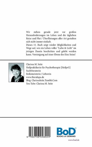 Wir stehen gerade jetzt vor großen Herausforderungen im Leben und die täglichen Reize und Flut/Überflutungen aller Art gestalten sich nicht immer einfach.Dieses 11. Buch zeigt wieder Möglichkeiten und Wege auf, wie ein Leben voller "Liebe & Licht" im jetzigen Dasein beschritten und gelebt werden kann. Vereinigung auf einer Ebene des Einz Seins!