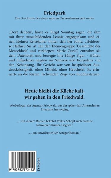Das leise Ticken von Friedpark, das in der Nacht zum Leben erwachte, die wunderliche Vertrautheit der Stimmen an diesem seltsamen Ort, schienen magisch und unwirklich. Die Bewohner hatten keine Existenz außer der, die sie sich selbst verliehen. Herr Heinrich war sicher, dass er gestorben war, und er wusste nur nicht genau, wann sein Denken wieder eingesetzt hatte, er wiedergeboren worden war. Alles, so fuhren seine Gedanken fort, was vorher gewesen ist, gehörte zu einer anderen Welt. Die Erinnerung an seine Familie fühlte sich an, als ob sie die Gespenster wären. Unbewusst zwängte er sich aus seinem Körper, und im Gegensatz zu früher, wo er selbst an heißen Tagen gefröstelt hatte, spürte er nicht den geringsten Temperaturunterschied. Er straffte seine Muskeln, obwohl es unnötig war. Seltsamerweise wollte er jetzt unbedingt die exakte Uhrzeit wissen. Als er jedoch nach seiner Taschenuhr wühlen wollte, musste er zu seinem Schrecken feststellen, dass die Westentasche leer war und seine Hand ins Nichts griff.... mit diesem Roman bekehrt Volker Schopf auch härteste Schwarzer-Humor-Gegner.
