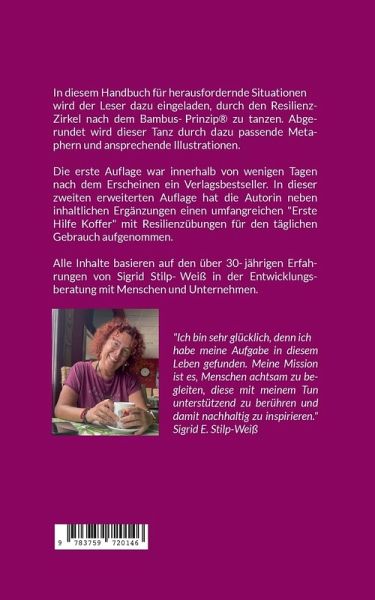 In diesem Handbuch für herausfordernde Situationen wird der Leser angeleitet, durch den Resilienz-Zirkel nach dem Bambus-Prinzip® zu tanzen. Abgerundet wird dieser Tanz durch dazu passende Metaphern und ansprechende Illustrationen. Die erste Auflage war innerhalb von wenigen Tagen nach dem Erscheinen ein Verlags-Bestseller. In dieser zweiten erweiterten Auflage hat die Autorin neben inhaltlichen Ergänzungen einen umfangreichen "Erste Hilfe Koffer" mit Resilienzübungen für den täglichen Gebrauch aufgenommen. Alle Inhalte basieren auf den über 30-jährigen Erfahrungen der Autorin in der Entwicklungsberatung mit Menschen und Unternehmen.…mehr