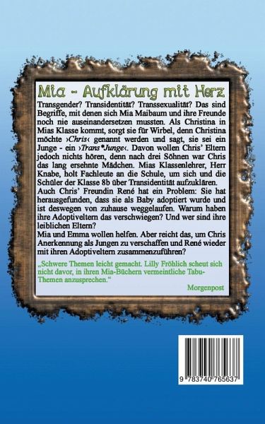 Transgender? Transidentität? Transsexualität? Das sind Begriffe, mit denen sich Mia Maibaum und ihre Freunde nie auseinander setzen mussten. Als Christina in Mias Klasse kommt, sorgt sie für Wirbel, denn Christina möchte 'Chris' genannt werden und sagt, sie sei ein Junge - ein "Trans_Junge". Davon wollen Chris' Eltern jedoch nichts hören, denn nach drei Söhnen war Chris das lang ersehnte Mädchen. Mias Klassenlehrer, Herr Knabe, holt Fachleute an die Schule, um sich und die Schüler der Klasse 8b über Transidentität aufzuklären.Auch Chris' Freundin René hat ein Problem: Sie hat herausgefunden, dass sie als Baby adoptiert wurde und ist deswegen von zuhause weggelaufen. Warum haben ihre Adoptiveltern das verschwiegen? Und wer sind ihre leiblichen Eltern? Warum gibt es Eltern, die ihre Kinder zur Adoption freigeben?Mia und Emma wollen helfen. Aber reicht das, um Chris Anerkennung als Jungen zu verschaffen und René wieder mit ihren Adoptiveltern zusammenzuführen?Dies ist die überarbeitete, neue Auflage 2020 des siebten Bandes der beliebten Mia-Buchreihe - Aufklärung mit Herz!"Schwere Themen leicht gemacht. Lilly Fröhlich scheut sich nicht davor, in ihren Mia-Büchern vermeintliche Tabu-Themen anzusprechen." (Morgenpost)