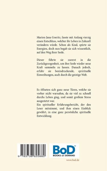 Marion Jana Goeritz, fasste mit Anfang vierzig einen Entschluss, welcher ihr Leben in Zukunft verändern würde. Schon als Kind, spürte sie Energien, doch nun begab sie sich wissentlich, auf den Weg ihrer Seele. Dieser führte sie zurerst in die Zurückgezogenheit, um ihre Seele wieder neue Kraft sammeln zu lassen. Danach jedoch erfuhr sie beeindruckende, sprirituelle Einweihungen, auch durch die geistige Welt. Es öffneten sich ganz neue Türen, welche sie vorher nicht warnahm, da sie viel zu schnell durchs Leben ging, und somit großem Stress ausgestetzt war.Ein spiritueller Erfahrungsbericht, der den Leser mitnimmt, und ihm einen Einblick gewährt, in eine ganz persönliche spirituelle Entwicklung.