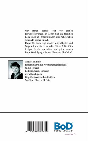 Wir stehen gerade jetzt vor großen Herausforderungen im Leben und die täglichen Reize und Flut/Überflutungen aller Art gestalten sich nicht immer einfach.Dieses 12. Buch zeigt wieder Möglichkeiten und Wege auf, wie ein Leben voller "Liebe & Licht" im jetzigen Dasein beschritten und gelebt werden kann. Vereinigung auf einer Ebene des Einsseins!