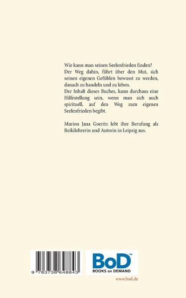 Wie kann man seinen Seelenfrieden finden? Der Weg dahin, führt über den Mut, sich seinen eigenen Gefühlen bewusst zu werden, danach zu handeln und zu leben. Der Inhalt dieses Buches kann durchaus eine Hilfestellung sein, wenn man sich auch spirituell auf den Weg zum eigenen Seelenfrieden begibt.Marion Jana Goeritz lebt ihre Berufung als Reikilehrerin und Autorin in Leipzig aus.