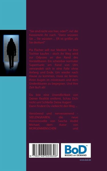 "Sie sind nicht von hier, oder?", rief die Kassiererin ihr nach. "Dann wüssten Sie ... Sie wüssten ... ER ist größer, als Sie denken!"Pia Fischer will nur Medizin für ihre Tochter kaufen - doch ihr Weg wird zur Odyssee an den Rand des Vorstellbaren. Ein scheinbar normaler Supermarkt verwandelt sich in eine Falle ohne Anfang und Ende. Um wieder nach Hause zu kommen, muss sie lernen, ihren Augen zu misstrauen und dem Undenkbaren zu begegnen. Und ihre Zeit läuft ab!Du bist eine Unendlichkeit von Zuhause entfernt.Schau Dich nicht um! Schließe Deine Augen! Dann findest Du vielleicht den Weg ...Verstörend und nervenzerrend - SEELENGRABEN, die neue, Horrornovelle von Sascha André Michael, dem Autor von MORGENMENSCHEN und SEELENFROST.