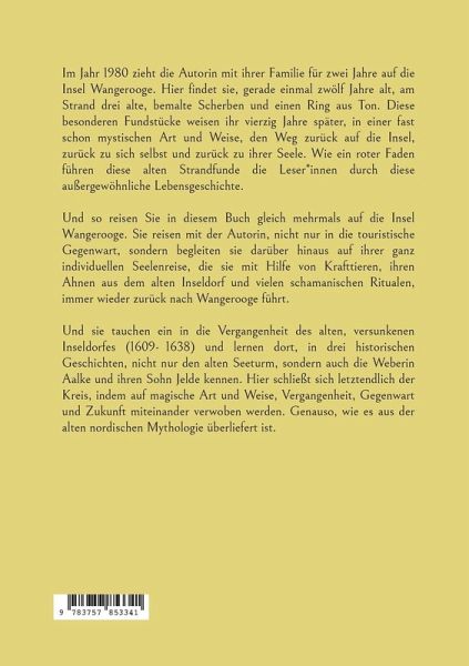 Im Jahr 1980 zieht die Autorin mit ihrer Familie für zwei Jahre auf die Insel Wangerooge. Hier findet sie, gerade einmal zwölf Jahre alt, am Strand drei alte, bemalte Scherben und einen Ring aus Ton. Diese besonderen Fundstücke weisen ihr vierzig Jahre später, in einer fast schon mystischen Art und Weise, den Weg zurück auf die Insel, zurück zu sich selbst und zurück zu ihrer Seele. Wie ein roter Faden führen diese alten Strandfunde die Leser_innen durch diese außergewöhnliche Lebensgeschichte.Und so reisen Sie in diesem Buch gleich mehrmals auf die Insel Wangerooge. Sie reisen mit der Autorin, nicht nur in die touristische Gegenwart, sondern begleiten sie darüber hinaus auf ihrer ganz individuellen Seelenreise, die sie mit Hilfe von Krafttieren, ihren Ahnen aus dem alten Inseldorf und vielen schamanischen Ritualen, immer wieder zurück nach Wangerooge führt. Und sie tauchen ein in die Vergangenheit des alten, versunkenen Inseldorfes (1609-1638) und lernen dort, in drei historischen Geschichten, nicht nur den alten Seeturm, sondern auch die Weberin Aalke und ihren Sohn Jelde kennen. Hier schließt sich letztendlich der Kreis, indem auf magische Art und Weise, Vergangenheit, Gegenwart und Zukunft miteinander verwoben werden. Genauso, wie es aus der alten nordischen Mythologie überliefert ist.