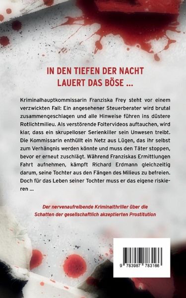 Der nervenaufreibende Kriminalthriller über die Schatten der gesellschaftlich akzeptierten Prostitution Kriminalhauptkommissarin Franziska Frey steht vor einem verzwickten Fall: Ein angesehener Steuerberater wird brutal zusammengeschlagen und alle Hinweise führen ins düstere Rotlichtmilieu. Als verstörende Foltervideos auftauchen, wird klar, dass ein skrupelloser Serienkiller sein Unwesen treibt. Die Kommissarin enthüllt ein Netz aus Lügen, das ihr selbst zum Verhängnis werden könnte und muss den Täter stoppen, bevor er erneut zuschlägt. Während Franziskas Ermittlungen Fahrt aufnehmen, kämpft Richard Erdmann gleichzeitig darum, seine Tochter aus den Fängen des Milieus zu befreien. Doch für das Leben seiner Tochter muss er das eigene riskieren … Erste Leser:innenstimmen „Die komplexe und gut durchdachte Handlung dieses Kriminalromans hat mich immer wieder überrascht und mitgerissen." „Der Thriller ist Spannung und Nervenkitzel pur! Die Jagd der Ermittlerin nach dem Serienkiller und die verzweifelten Versuche von Richard Erdmann, seine Tochter zu retten, haben mich förmlich an die Seiten gefesselt." „Die Autorin gestaltet die Protagonisten vielschichtig und authentisch, ihre inneren Konflikte und emotionalen Kämpfe machen sie greifbar und berührend." „Ein düsterer Pageturner mit einem Serienmörder, der ein brutales Katz und Maus Spiel betreibt."