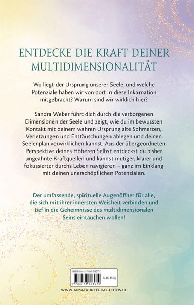 Sandra Weber führt uns durch die verborgenen Dimensionen der Seele und zeigt, wie wir im bewussten Kontakt mit unserem wahren Ursprung alte Schmerzen, Verletzungen und Enttäuschungen ablegen und unseren Seelenplan verwirklichen können. Indem wir lernen, mehr und mehr die höhere Perspektive unserer Seele einzunehmen, entdecken wir unsere innerste Kraft und können frei von Angst offen durchs Leben navigieren: mit fokussierter Klarheit und in vollem Einklang mit unseren unerschöpflichen Potenzialen.