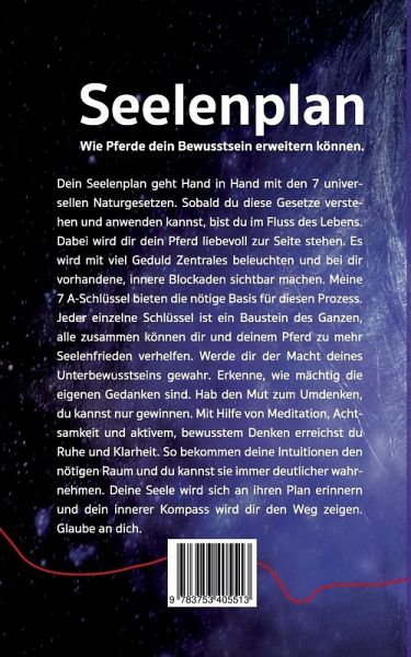 Dein Seelenplan geht Hand in Hand mit den 7 universellen Naturgesetzen. Sobald du diese Gesetze verstehen und anwenden kannst, bist du im Fluss des Lebens. Dabei wird dir dein Pferd liebevoll zur Seite stehen. Es wird mit viel Geduld Zentrales beleuchten und bei dir vorhandene, innere Blockaden sichtbar machen. Meine 7 A-Schlüssel bieten die nötige Basis für diesen Prozess. Jeder einzelne Schlüssel ist ein Baustein des Ganzen, alle zusammen können dir und deinem Pferd zu mehr Seelenfrieden verhelfen. Werde dir der Macht deines Unterbewusstseins gewahr. Erkenne, wie mächtig die eigenen Gedanken sind. Hab den Mut zum Umdenken, du kannst nur gewinnen. Mit Hilfe von Meditation, Achtsamkeit und aktivem, bewusstem Denken erreichst du Ruhe und Klarheit. So bekommen deine Intuitionen den nötigen Raum und du kannst sie immer deutlicher wahrnehmen. Deine Seele wird sich an ihren Plan erinnern und dein innerer Kompass wird dir den Weg zeigen. Glaube an dich.