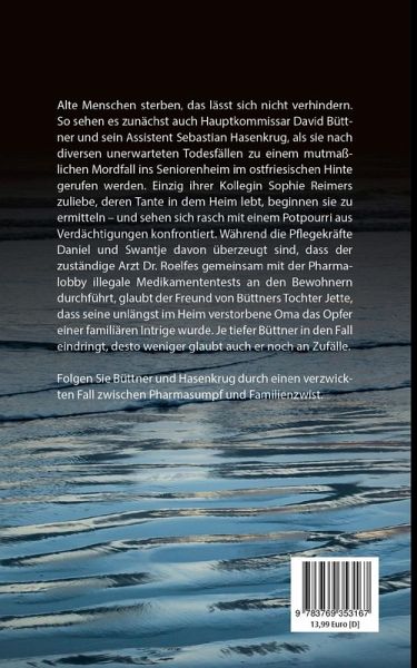 Alte Menschen sterben, das lässt sich nicht verhindern. So sehen es zunächst auch Hauptkommissar David Büttner und sein Assistent Sebastian Hasenkrug, als sie nach diversen unerwarteten Todesfällen zu einem mutmaßlichen Mordfall ins Seniorenheim im ostfriesischen Hinte gerufen werden. Einzig ihrer Kollegin Sophie Reimers zuliebe, deren Tante in dem Heim lebt, beginnen sie zu ermitteln ... und sehen sich rasch mit einem Potpourri aus Verdächtigungen konfrontiert. Während die Pflegekräfte Daniel und Swantje davon überzeugt sind, dass der zuständige Arzt Dr. Roelfes gemeinsam mit der Pharmalobby illegale Medikamententests an den Bewohnern durchführt, glaubt der Freund von Büttners Tochter Jette, dass seine unlängst im Heim verstorbene Oma das Opfer einer familiären Intrige wurde. Je tiefer Büttner in den Fall eindringt, desto weniger glaubt auch er noch an Zufälle. Folgen Sie Büttner und Hasenkrug durch einen verzwickten Fall zwischen Pharmasumpf und Familienzwist.