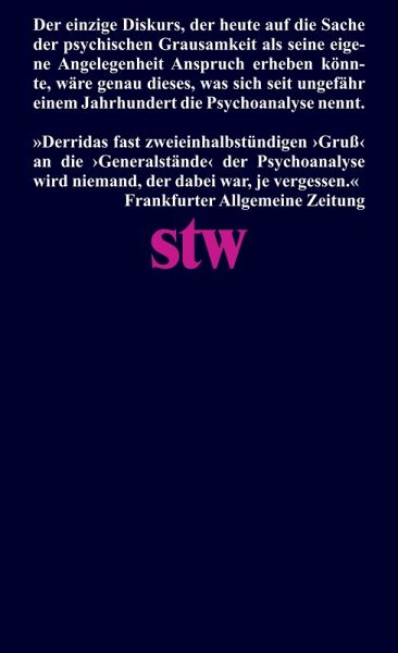 In einer Lektüre Freud'scher Texte, die sich um den Begriff der »Grausamkeit« ranken, erkundet Derrida mögliche Antworten auf die Frage, worin die Krise der Psychoanalyse heute besteht. Ausgehend von der These, dass die Psychoanalyse der Name dessen sein könnte, was sich ohne jegliches Alibi dem Eigensten der psychischen Grausamkeit zuwendet, versucht Derrida die Möglichkeit zu denken, wie jenseits der Logik des Todestriebes Recht, Politik und vielleicht sogar eine Ethik begründet werden könnten, die der psychoanalytischen Revolution wie auch den Ereignissen Rechnung tragen, die einen grausamen Wandel der Grausamkeit darstellen - den technischen, wissenschaftlichen, juridischen, ökonomischen, ethischen und politischen Veränderungen unserer Zeit.