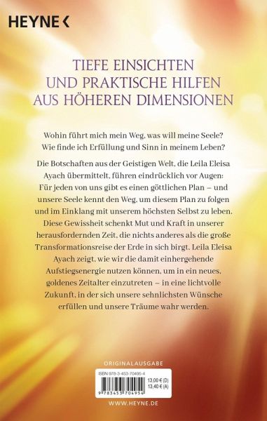 Die Botschaften aus der Geistigen Welt, die Leila Eleisa Ayach übermittelt, führen eindrücklich vor Augen: Für jeden von uns gibt es einen göttlichen Plan - und unsere Seele kennt den Weg, um diesem Plan zu folgen und im Einklang mit unserem höchsten Selbst zu leben. Diese Gewissheit schenkt Mut und Kraft in unserer herausfordernden Zeit, die nichts anderes als die große Transformationsreise der Erde in sich birgt. Leila Eleisa Ayach zeigt, wie wir die damit einhergehende Aufstiegsenergie nutzen können, um in ein neues, goldenes Zeitalter einzutreten - in eine lichtvolle Zukunft, in der sich unsere sehnlichsten Wünsche erfüllen und unsere Träume wahr werden.