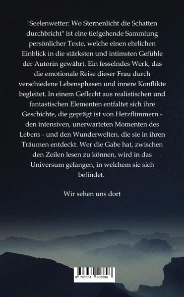 "Seelenwetter: Wo Sternenlicht die Schatten durchbricht" ist eine tiefgehende Sammlung persönlicher Texte, welche einen ehrlichen Einblick in die stärksten und intimsten Gefühle der Autorin gewährt. Ein fesselndes Werk, das die emotionale Reise dieser Frau durch verschiedene Lebensphasen und innere Konflikte begleitet. In einem Geflecht aus realistischen und fantastischen Elementen entfaltet sich ihre Geschichte, die geprägt ist von Herzflimmern - den intensiven, unerwarteten Momenten des Lebens - und den Wunderwelten, die sie in ihren Träumen entdeckt. Wer die Gabe hat, zwischen den Zeilen lesen zu können, wird in das Universum gelangen, in welchem sie sich befindet. Wir sehen uns dort!