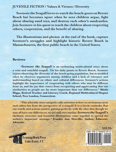 Seemore the Seagull is a loveable people-watcher who observes the behavior of the diverse beach-goers on Revere Beach. He wants everyone to get along no matter what color, language, shape, or size. He becomes very upset when he sees some children argue and fight about sharing sand toys and destroying each other's sandcastles. He helps them learn to cooperate, and together they build a castle that makes them all happy. By listening or reading the story, young children learn respect for diversity and the benefits of sharing and cooperation. The illustrations and photos in the book capture the…mehr