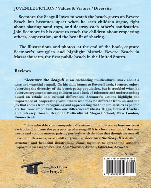 Seemore the Seagull is a lovable people-watcher who observes the behavior of the diverse beach-goers on Revere Beach. He wants everyone to get along no matter what color, language, shape, or size. He becomes very upset when he sees some children argue and fight about sharing sand toys and destroying each other's sandcastles. He helps them learn to cooperate, and together they build a castle that makes them all happy. By listening or reading the story, young children learn respect for diversity and the benefits of sharing and cooperation. The illustrations and photos in the book capture the…mehr