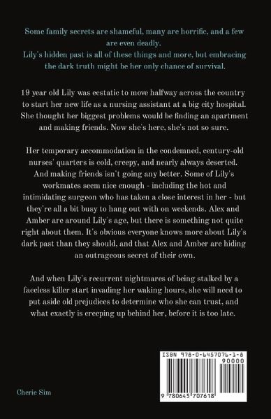 Some family secrets are shameful, many are horrific, and a few are even deadly. Lily's hidden past is all of these things and more, but embracing the dark truth might be her only chance of survival. 19 year old Lily was ecstatic to move halfway across the country to start her new life as a nursing assistant at a big city hospital. She thought her biggest problems would be finding an apartment and making new friends. Now that she's here, she's not so sure. Her temporary accommodation in the condemned, century-old nurses' quarters is creepy, cold, and nearly always deserted. And making friends isn't going any better. Some of Lily's workmates seem nice enough - including the hot and intimidating surgeon who has taken a close interest in her - but they're all a bit busy to hang out with on weekends. Alex and Amber are around Lily's age, but there is something not quite right about them. It's obvious everyone knows more about Lily's dark past than they should, and Amber and Alex are hiding an outrageous secret of their own. And when Lily's recurrent nightmares of being stalked by a faceless killer start invading her waking hours, she will need to put aside old prejudices to determine who she can trust and what exactly is creeping up behind her, before it's too late.