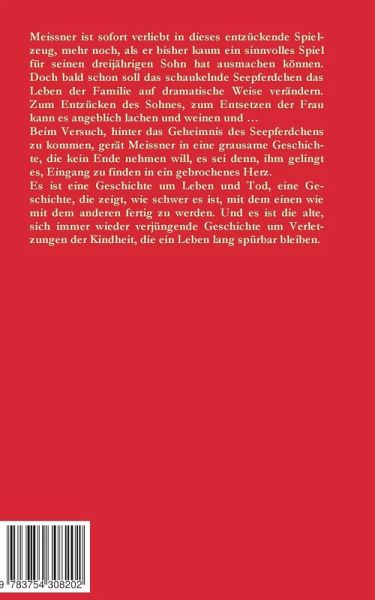 Meissner ist sofort verliebt in dieses entzückende Spielzeug, mehr noch, als er bisher kaum ein sinnvolles Spiel für seinen dreijährigen Sohn hat ausmachen können. Doch bald schon soll das schaukelnde Seepferdchen das Leben der Familie auf dramatische Weise verändern. Zum Entzücken des Sohnes, zum Entsetzen der Frau kann es angeblich lachen und weinen.Beim Versuch, hinter das Geheimnis des Seepferdchens zu kommen, gerät Meissner in eine grausame Geschichte, die kein Ende nehmen will, es sei denn, ihm gelingt es, Eingang zu finden in ein gebrochenes Herz.Es ist eine Geschichte um Leben und Tod, eine Geschichte, die zeigt, wie schwer es ist, mit dem einen wie mit dem anderen fertig zu werden. Und es ist die alte, sich immer wieder verjüngende Geschichte um Verletzungen der Kindheit, die ein Leben lang spürbar bleiben.