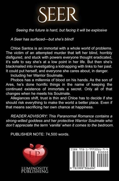 Seeing the future is hard, but facing it will be explosive A Seer has surfaced-but she's blind! Chloe Santos is an immortal with a whole world of problems. The victim of an attempted murder that left her blind, horribly disfigured, and stuck with powers everyone thought eradicated, it's safe to say she's at a low point in her life. But then she's blackmailed into investigating a kidnapping with links to her past. It could put herself, and everyone she cares about, in danger. Including her Warrior Soulmate. Phobos has a millennia of blood on his hands. As the son of Ares, he's done horrific things in the name of keeping the continued existence of immortals a secret. Only all of that changes when he meets his Soulmate. Allegiances shift, trust is thin and Chloe has to decide if she should risk everything to make the world a better place. Even if that means sacrificing her own chance at happiness. READER ADVISORY: This Paranormal Romance contains a strong-willed goddess and her protective Warrior Soulmate who don't appreciate the term 'vanilla' when it comes to the bedroom. PUBLISHER NOTE: 74,500 words.
