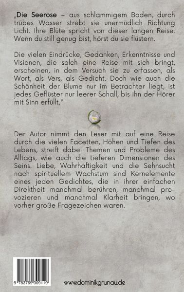 Die Seerose - aus schlammigem Boden, durch trübes Wasser strebt sie unermüdlich Richtung Licht. Ihre Blüte spricht von dieser langen Reise. Wenn du still genug bist, hörst du sie flüstern. Die vielen Eindrücke, Gedanken, Erkenntnisse und Visionen, die solch eine Reise mit sich bringt, erscheinen, in dem Versuch sie zu erfassen, als Wort, als Vers, als Gedicht. Doch wie auch die Schönheit der Blume nur im Betrachter liegt, ist jedes Geflüster nur leerer Schall, bis ihn der Hörer mit Sinn erfüllt. Der Autor nimmt den Leser mit auf eine Reise durch die vielen Facetten, Höhen und Tiefen des Lebens, streift dabei Themen und Probleme des Alltags, wie auch die tieferen Dimensionen des Seins. Liebe, Wahrhaftigkeit und die Sehnsucht nach spirituellem Wachstum sind Kernelemente eines jeden Gedichtes, die in ihrer einfachen Direktheit manchmal berühren, manchmal provozieren und manchmal Klarheit bringen, wo vorher große Fragezeichen waren.