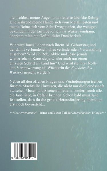 "Ich schloss meine Augen und kletterte über die Reling. Und während meine Hände sich vom Metall lösten und meine Beine sich vom Schiff wegstießen, die wenigen Sekunden in der Luft, bevor ich ins Wasser eindrang, überkam mich ein Gefühl tiefer Dankbarkeit."Wie wird Janes Leben nach ihrem 18. Geburtstag und der damit verbundenen, alles verändernden Verwandlung aussehen? Wird sie Rob, Abbie und Josie jemals wiedersehen? Kann sie je wieder auch nur einen einzigen Schritt an Land tun? Und wird sie ihrer Rolle und Verantwortung als Wächterin des Zeichens des Wassers gerecht werden?Neben all den offenen Fragen und Veränderungen treiben finstere Mächte ihr Unwesen, die nicht nur die Feindschaft zwischen Musen und Sirenen anfeuern, sondern auch alle, die Jane liebt, in Gefahr bringen. Schon bald muss Jane feststellen, dass ihr die größte Herausforderung überhaupt erst noch bevorsteht...»Seesternenhimmel« ist der dritte und letzte Teil der »Meeresfunkeln«-Trilogie.