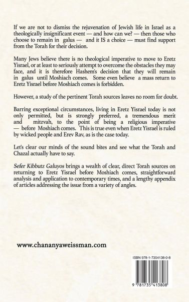 If we are not to dismiss the rejuvenation of Jewish life in Israel as a theologically insignificant event - and how can we? - then those who choose to remain in galus - and it IS a choice - must find support from the Torah for their decision. Many Jews believe there is no theological imperative to move to Eretz Yisrael, or at least to seriously attempt to overcome the obstacles they may face, and it is therefore Hashem's decision that they will remain in galus until Moshiach comes. Some even believe a mass return to Eretz Yisrael before Moshiach comes is forbidden. However, a study of the pertinent Torah sources leaves no room for doubt. Barring exceptional circumstances, living in Eretz Yisrael today is not only permitted, but is strongly preferred, a tremendous merit and mitzvah, to the point of being a religious imperative - before Moshiach comes. This is true even when Eretz Yisrael is ruled by wicked people and Erev Rav, as is the case today. Let's clear our minds of the sound bites and see what the Torah and Chazal actually have to say. Sefer Kibbutz Galuyos brings a wealth of clear, direct Torah sources on returning to Eretz Yisrael before Moshiach comes, straightforward analysis and application to contemporary times, and a lengthy appendix of articles addressing the issue from a variety of angles.