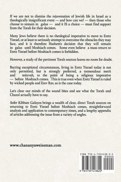 If we are not to dismiss the rejuvenation of Jewish life in Israel as a theologically insignificant event - and how can we? - then those who choose to remain in galus - and it IS a choice - must find support from the Torah for their decision. Many Jews believe there is no theological imperative to move to Eretz Yisrael, or at least to seriously attempt to overcome the obstacles they may face, and it is therefore Hashem's decision that they will remain in galus until Moshiach comes. Some even believe a mass return to Eretz Yisrael before Moshiach comes is forbidden. However, a study of the pertinent Torah sources leaves no room for doubt. Barring exceptional circumstances, living in Eretz Yisrael today is not only permitted, but is strongly preferred, a tremendous merit and mitzvah, to the point of being a religious imperative - before Moshiach comes. This is true even when Eretz Yisrael is ruled by wicked people and Erev Rav, as is the case today. Let's clear our minds of the sound bites and see what the Torah and Chazal actually have to say. Sefer Kibbutz Galuyos brings a wealth of clear, direct Torah sources on returning to Eretz Yisrael before Moshiach comes, straightforward analysis and application to contemporary times, and a lengthy appendix of articles addressing the issue from a variety of angles.