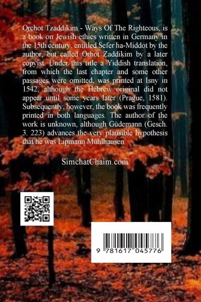 Sefer ORCHOT TZADIKIM ¿¿¿¿¿¿ ¿¿¿¿¿¿ Ways of the Righteous Orchot Tzaddikim [Hebrew: ¿¿¿¿¿ ¿¿¿¿¿¿] is a book on Jewish ethics written in Germany in the 15th century, entitled Sefer ha-Middot by the author, but called Or¿ot ¿addi¿im by a later copyist. Under this title, a Yiddish translation, from which the last chapter and some other passages were omitted, was printed at Isny in 1542, although the Hebrew original did not appear until some years later [Prague, 1581]. Subsequently, however, the book was frequently printed in both languages. The author of the work is unknown, although Güdemann (Gesch. 3. 223) advances the very plausible hypothesis that he was Lipmann Mühlhausen. The book Most of the book is not original writing; it follows the order of The Improvement of the Moral Qualities by Solomon ibn Gabirol, adding paragraphs from many of Maimonides' works, and ideas from the famous ethical writings - Shaarei Tshuva [by Rabbenu Yona of Gerona] and Chovot HaLevavot. The Or¿ot ¿addi¿im, which was designed to be a very popular code of ethics, contains the following maxims among others: It is evil pride to despise others and to regard one's own opinion as the best, since such an attitude bars progress, while egotism increases bitterness toward others and decreases thine own capability of improvement. Be just and modest in association with others, and practice humility even toward the members of the household, toward the poor, and toward dependents. The more property thou hast, the greater should be thy humility and thy honor and beneficence toward mankind. Be kind to thy non-Jewish servants; make not their burdens heavy, nor treat them scornfully with contemptuous words or blows. Forget not the good qualities thou lackest, and note thy faults, but forget the good that thou hast done, and the injuries thou hast received. Abash not him who hath a bodily blemish, or in whose family there is some stain. If one hath done evil and repented, name not his deed in his presence, even in jest, nor refer to a quarrel which has been ended, lest the dead embers be rekindled. The author bitterly attacks the pilpul method of study, reproves his countrymen who engage in this method of Talmud study, and reproaches those who neglect the study of the Bible and of all sciences.