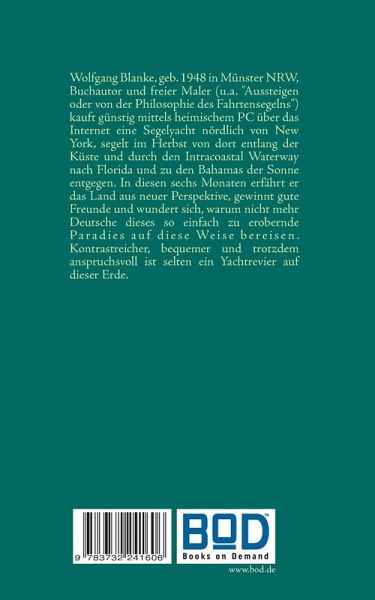Wolfgang Blanke, geb. 1948 in Münster NRW, Buchautor und freier Maler (u.a. "Aussteigen oder von der Philosophie des Fahrtensegelns") kauft günstig mittels heimischem PC über das Internet eine Segelyacht nördlich von New York, segelt im Herbst von dort entlang der Küste und durch den Intracoastal Waterway nach Florida und zu den Bahamas der Sonne entgegen. In diesen sechs Monaten erfährt er das Land aus neuer Perspektive, gewinnt gute Freunde und wundert sich, warum nicht mehr Deutsche dieses so einfach zu erobernde Paradies auf diese Weise bereisen. Kontrastreicher, bequemer und trotzdem anspruchsvoll ist selten ein Yachtrevier auf dieser Erde.