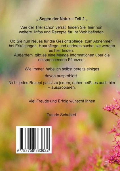 Segen der Natur Teil 2 Wie der Titel schon verrät, finden Sie hier nun weitere Infos und Rezepte für Ihr Wohlbefinden.Ob Sie nun Neues für die Gesichtspflege, zum Abnehmen, bei Erkältungen, Haarpflege und anderes suche, sie werden es hier finden. Außerdem gibt es eine Menge Informationen über die entsprechenden Pflanzen. Wie immer, habe ich selbst bereits einigesdavon ausprobiert. Nicht jedes Rezept passt zu jedem, daher heißt es auch hier ausprobieren.Viel Freude und Erfolg wünscht IhnenTraude Schubert
