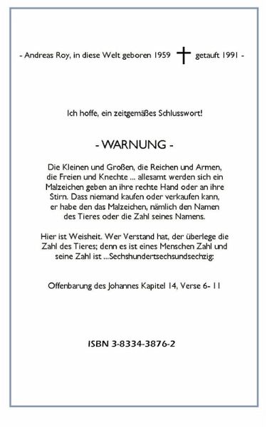 Nun aber bleiben Glaube, Hoffnung, Liebe, diese drei; aber die Liebe ist die größte unter ihnen. (1. Kor. 13, 13) Dieser Satz beschreibt, was mit dem "Segensgruß vom Kirchenstörer" ihren Anfang genommen hat. In diesem Buch geht es um den Glauben, das Vertrauen Gott gegenüber mit seinen herrlichsten Zusagen, die eine treibende Kraft freisetzt, auf Hoffnung weiterzusagen und mitzuteilen, was einen selbst ergreifen kann. Diese Arbeit auf Hoffnung wird dann in dem zweiten Buch "Segensgruß vom Störenfriede" mit reichlich Bildmaterial angereichert sein. Diese Liebe ist das Größte unter uns, womit wir dann auch schon bei dem dritten Buch wären, was noch vom Kirchenstörer erscheinen soll, welches die tiefsten Geheimnisse dieses "Liebes- Rufes" von A bis O im Detail offenbart. Diese Erzählungen sind nicht wie sonst rein zufällig, die Örtlichkeiten und Begebenheiten nicht frei erfunden - sondern authentisch! Der Autor wünscht, dass der Glaube zum Schauen wird, die Hoffnung beim Lesen sich erfüllt und die Liebe einen jeden ergreift!