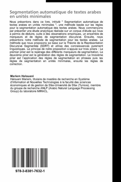 Nous présentons dans ce livre, intitulé " Segmentation automatique de textes arabes en unités minimales ", une méthode basée sur les règles pour la segmentation automatique des textes arabes. Nous commençons par présenter une étude analytique réalisée sur un corpus d étude qui nous a permis de déduire, suite à des observations empiriques, un ensemble de marqueurs et de règles de segmentation discursive. Ensuite, nous présentons notre méthode de segmentation pour les textes arabes. La méthode que nous proposons se base sur la Théorie de la Représentation Discursive Segmentée (SDRT) et utilise des connaissances purement linguistiques. Le principe de notre proposition s appuie sur trois piliers : Le premier pilier est le repérage des différents marqueurs de segmentation. Le deuxième pilier est la génération des règles de segmentation. Le troisième pilier est l application des règles de segmentation en phrases puis les règles de segmentation en unités minimales, ensuite les règles de correction.