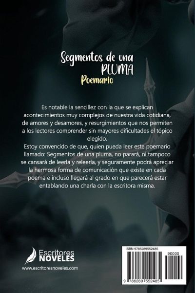 Cuando mi amiga y colega de la poesía, Karina Sepúlveda, me comentó su grandiosa idea de compilar todos sus escritos no me imaginé lo sorprendente que sería para mi descubrir la variada, pero hermosa forma de expresarse a través de las letras y lo fantástico que es encontrar la cantidad de personas que, como uno, conectan con tal capacidad de comunicar sus pensamientos, sentimientos y sensaciones a través de la palabra escrita. De tal manera que pareciera que escuchamos en cada sílaba su respiración y hasta el latir de sus corazones, es como si en cada palabra pusiera su vida y en cada renglón sus anhelos plasmados por la pluma que dirige su mano. Estoy convencido de que, quien pueda leer este poemario llamado: Un Libro Para SoñarSegmentos de una pluma, no parará, ni tampoco se cansará de leerla y releerla, y seguramente podrá apreciar la hermosa forma de comunicación que existe en cada poema e incluso llegará al grado en que pareciera estar entablando una charla con la escritora, y al terminar estará convencido de conocerla como si fuese amiga de años a quien aprende a conocer mediante sus poemas. >Tengo el agrado de dar testimonio de esta obra maestra, cuya autora no solo es una colega si no una gran amiga entrañable. Aprecio todo el trabajo realizado por esta excelente escritora, considero importante confesar mi admiración por esta creación. Es notable la sencillez con la que se explican acontecimientos muy complejos de nuestra vida cotidiana, de amores y desamores, y resurgimientos que nos permiten a los lectores comprender sin mayores dificultades el tópico elegido. Confío que esta creación de la escritora cucuteña, Karina Sepúlveda, pasará a ser un clásico en las bibliotecas de muchas familias y un buen material de lectura. Esto se debe a la riqueza tanto en información que se nos brinda, como en el plano artístico que nos ofrece esta artista. >ANÓNIMO.