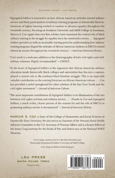 In Segregated Soldiers, Marcus S. Cox investigates military training programs at historically black colleges and universities and demonstrates their importance to the struggle for civil rights. Examining African Americans' attitudes toward service in the armed forces, Cox focuses on the ways in which black higher education and Reserve Officer Training Corps programs worked together to advance full citizenship rights for African Americans. Educators at black colleges supported military training as early as the late nineteenth century in hopes of improving the social, economic, and political state of black citizens. Their attitudes reflected the long-held belief of many African Americans who viewed military service as a path to equal rights. Cox begins his narrative in the decades following the Civil War, when the movement to educate blacks became an essential element in the effort to offer equality to all African Americans. ROTC training emerged as a fundamental component of black higher education, as African American educators encouraged military activities to promote discipline, upright behavior, and patriotism. These virtues, they believed, would hasten African Americans' quest for civil rights and social progress. Using Southern University one of the largest African American institutions of higher learning during the post World War II era as a case study, Cox shows how blacks' interest in military training and service continued to rise steadily throughout the 1950s. Even in the 1960s and early 1970s, despite the growing unpopularity of the Vietnam War, the rise of black nationalism, and an expanding economy that offered African Americans enhanced economic opportunities, support for the military persisted among blacks because many believed that service in the armed forces represented the best way to advance themselves in a society in which racial discrimination flourished. Unlike recent scholarship on historically black colleges and universities, Cox's study moves beyond institutional histories to provide a detailed examination of broader social, political, and economic issues, and demonstrates why military training programs remained a vital part of the schools' missions.