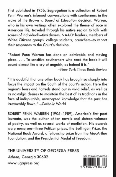 First published in 1956, Segregation is a collection of Robert Penn Warren's informal conversations with southerners in the wake of the Brown v. Board of Education decision. Warren, who in his own writing often explored the theme of race in American life, traveled through his native region to talk with scores of individuals - taxi drivers, NAACP leaders, members of White Citizens groups, college students, preachers - to report their responses to the Court's decision.