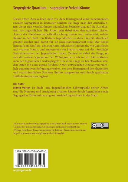 Dieses Open-Access-Buch stellt vor dem Hintergrund einer zunehmenden sozialen Segregation in deutschen Städten die Frage nach den Auswirkungen dieser sich verschärfenden räumlichen Polarisierung auf die Sozialisation von Jugendlichen. Die Arbeit geht dabei über den quartiersfixierten Ansatz der Nachbarschaftseffektforschung hinaus und untersucht, welche Räume in der Stadt von Berliner Jugendlichen in ihrer Freizeit tatsächlich genutzt werden und damit für sie sozialisationsrelevant sind. Der Fokus liegt auf dem Einfluss, den einerseits individuelle Merkmale, wie Geschlecht und sozialer Status, und andererseits die Stadtstruktur auf das räumliche Freizeitverhalten der Jugendlichen haben. Zentral ist dabei die Frage, ob sich die soziale Segregation der Wohnquartier auch in den Aktivitätsräumen der Jugendlichen widerspiegelt. Um diese Frage zu beantworten, werden Daten mit einer eigens für diese Arbeit entwickelten innovativen räumlich-quantitativen Befragung erhoben, vor dem Hintergrund der physischen und sozialräumlichen Struktur Berlins ausgewertet und durch qualitative Leitfadeninterviews ergänzt.