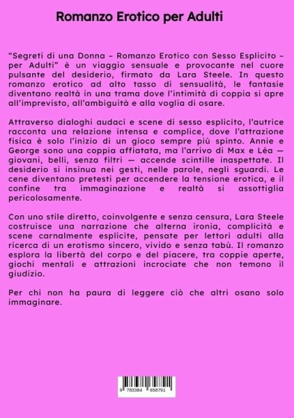 "Segreti di una Donna - Romanzo Erotico con Sesso Esplicito - per Adulti" è un viaggio sensuale e provocante nel cuore pulsante del desiderio, firmato da Lara Steele. In questo romanzo erotico ad alto tasso di sensualità, le fantasie diventano realtà in una trama dove l'intimità di coppia si apre all'imprevisto, all'ambiguità e alla voglia di osare.Attraverso dialoghi audaci e scene di sesso esplicito, l'autrice racconta una relazione intensa e complice, dove l'attrazione fisica è solo l'inizio di un gioco sempre più spinto. Annie e George sono una coppia affiatata, ma l'arrivo di Max e Léa - giovani, belli, senza filtri - accende scintille inaspettate. Il desiderio si insinua nei gesti, nelle parole, negli sguardi. Le cene diventano pretesti per accendere la tensione erotica, e il confine tra immaginazione e realtà si assottiglia pericolosamente.Con uno stile diretto, coinvolgente e senza censura, Lara Steele costruisce una narrazione che alterna ironia, complicità e scene carnalmente esplicite, pensate per lettori adulti alla ricerca di un erotismo sincero, vivido e senza tabù. Il romanzo esplora la libertà del corpo e del piacere, tra coppie aperte, giochi mentali e attrazioni incrociate che non temono il giudizio.Per chi non ha paura di leggere ciò che altri osano solo immaginare.
