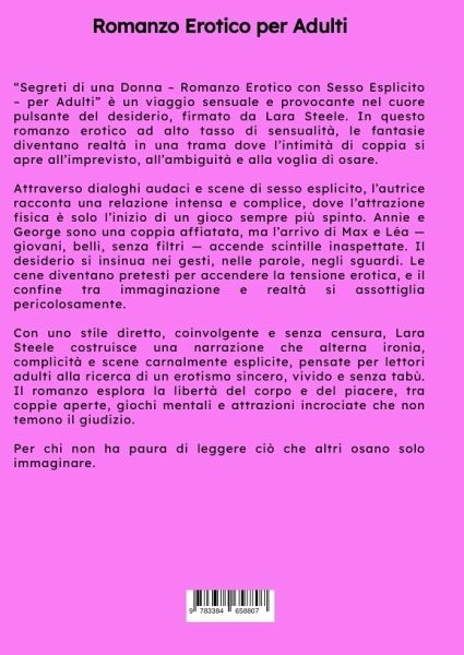 "Segreti di una Donna - Romanzo Erotico con Sesso Esplicito - per Adulti" è un viaggio sensuale e provocante nel cuore pulsante del desiderio, firmato da Lara Steele. In questo romanzo erotico ad alto tasso di sensualità, le fantasie diventano realtà in una trama dove l'intimità di coppia si apre all'imprevisto, all'ambiguità e alla voglia di osare.Attraverso dialoghi audaci e scene di sesso esplicito, l'autrice racconta una relazione intensa e complice, dove l'attrazione fisica è solo l'inizio di un gioco sempre più spinto. Annie e George sono una coppia affiatata, ma l'arrivo di Max e Léa - giovani, belli, senza filtri - accende scintille inaspettate. Il desiderio si insinua nei gesti, nelle parole, negli sguardi. Le cene diventano pretesti per accendere la tensione erotica, e il confine tra immaginazione e realtà si assottiglia pericolosamente.Con uno stile diretto, coinvolgente e senza censura, Lara Steele costruisce una narrazione che alterna ironia, complicità e scene carnalmente esplicite, pensate per lettori adulti alla ricerca di un erotismo sincero, vivido e senza tabù. Il romanzo esplora la libertà del corpo e del piacere, tra coppie aperte, giochi mentali e attrazioni incrociate che non temono il giudizio.Per chi non ha paura di leggere ciò che altri osano solo immaginare.