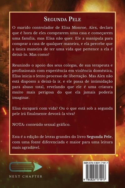 O marido controlador de Elisa Monroe, Alex, declara que é hora de eles comprarem uma casa e começarem uma família, mas Elisa não quer. Ele a manipula para comprar a casa de qualquer maneira, e ela percebe que a única maneira de ter uma vida que pertence a ela é deixá-lo. Mas como? Reunindo o apoio dos seus colegas, de sua terapeuta e profissionais com experiência em violência doméstica, Elisa inicia o lento processo de libertação. Mas Alex não está disposto a deixá-la ir, e ele passa de intimidação para abuso total, revelando que ele é uma criatura muito mais perigosa do que ela jamais poderia imaginar. Elisa escapará com vida? Ou o que está sob a segunda pele irá finalmente devorá-la viva? NOTA: conteúdo sexual gráfico. Esta é a edição de letras grandes do livro Segunda Pele, com uma fonte diferenciada e maior para uma leitura mais agradável.