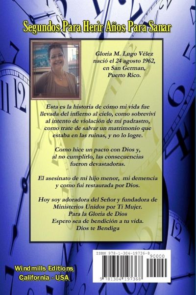 Esta es la historia de cómo mi vida fue llevada del infierno al cielo, como sobreviví al intento de violación de mi padrastro, como trate de salvar un matrimonio que estaba en las ruinas, y no lo logre. Como hice un pacto con Dios y, al no cumplirlo, las consecuencias fueron devastadoras. El asesinato de mi hijo menor, mi demencia y como fui restaurada por Dios. Hoy soy adoradora del Señor y fundadora de Ministerios Unidos por Ti Mujer. Para la Gloria de Dios Espero sea de bendición a tu vida. Dios te Bendiga